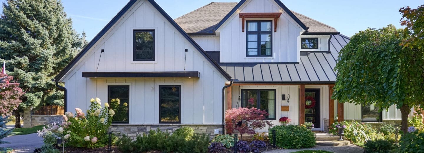 Exterior view of a coastal house in Niagara-on-the-Lake, featuring a charming balcony and boards and batten siding.