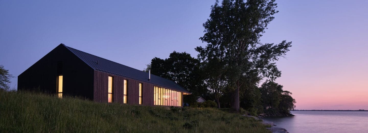 The house is a stunning example of mid-century modern architecture, gracefully situated on a serene waterfront lot.