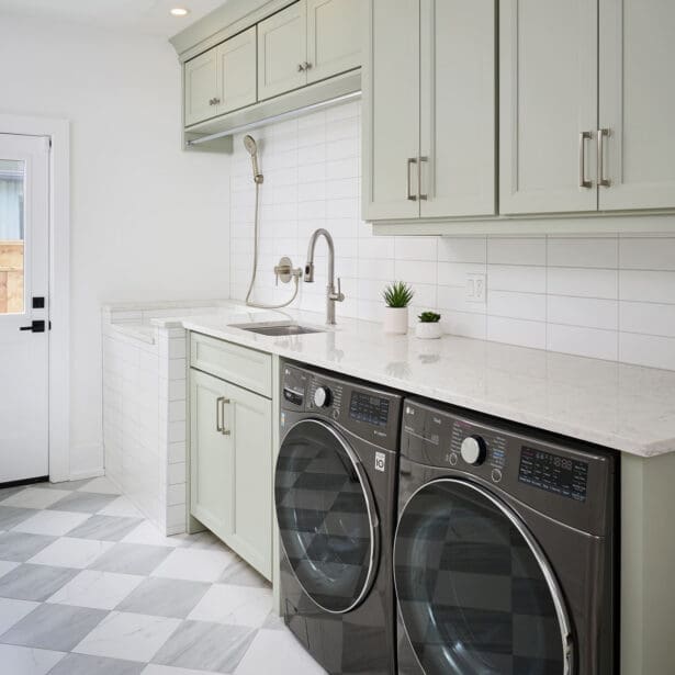 This modern farmhouse exudes charm and elegance with its pristine white board and batten siding, creating a classic yet contemporary look.