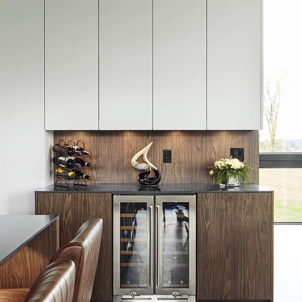 One of the standout features is the impressive 20-foot floor-to-ceiling windows, creating a dramatic focal point in the living area and offering breathtaking views of the surrounding landscape. This space is perfect for both relaxation and entertaining, merging the indoors with the beauty of the outside world.