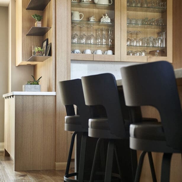 This renovation project transforms the great room with an expansive redesign, featuring impressive 15-foot floor-to-ceiling windows. These windows flood the space with natural light, offering breathtaking views and creating a seamless connection between indoor and outdoor environments. The elevated ceiling adds to the room’s grandeur, making it a perfect space for both relaxation and entertainment.