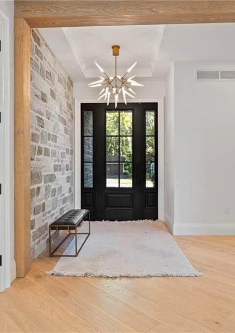 Inside, elevated exposed beams add architectural interest and a touch of rustic charm to the contemporary aesthetic. The tall ceilings enhance the sense of space and openness throughout the home, creating an airy and inviting atmosphere.